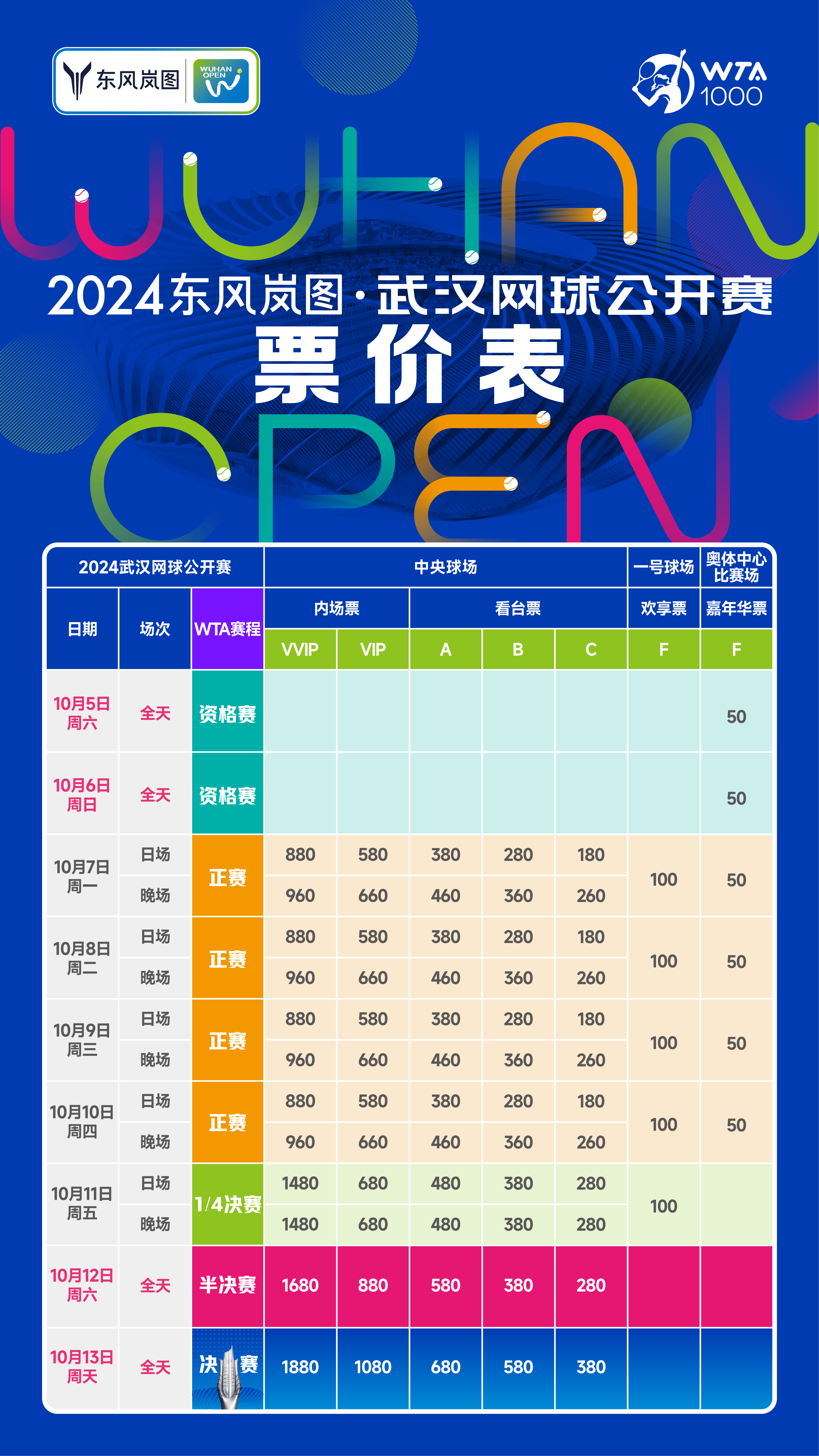 三个场馆还将提供单独售票服务,包括嘉年华票、欢享票和中央球场票等多种门票类型。其中,资格赛、半决赛和决赛不设日夜分场,而正赛则提供日场和晚场的票务选择。中央球场包含内场票,价格也从最低580元至1880元不等,看台票价格则从180元到680元不等。